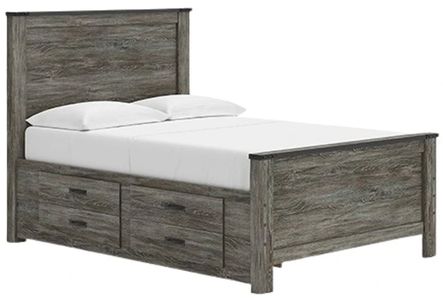 Includes panel headboard, footboard, under bed storage with side rail and roll slats