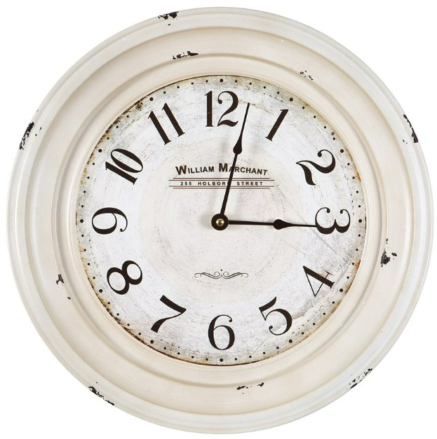 This cottage-style circular wall clock has a distressed white frame with two grooves in the frame. The dial is also a distressed white to match. The numbers and hands are both black. The words William Marchant are stamped right under the 12 o'clock.Read More
