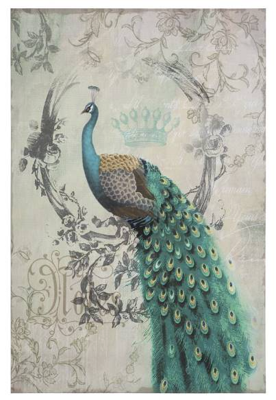 Left facing peacock printed in soft tints of aqua, teal and green with metal accents on a linen canvas. Make a bold statement by incorporating this wall art into your home.Read More
