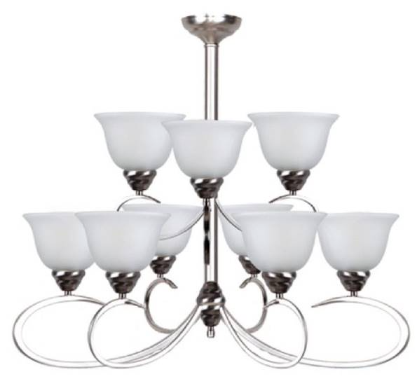 The Ribbon Falls Collection presents this elegant 9-light chandelier by YHD. Constructed of steel this chandelier is durable and easy to care for. Finished in a sparkling Satin Nickel decked with White etched glass semi-trumpet style glass shades.Read More