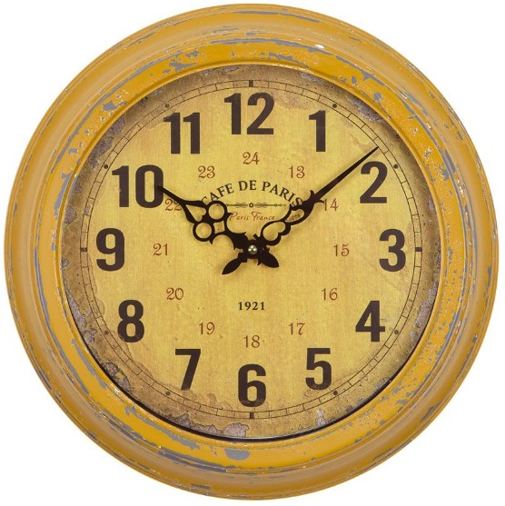 There is nothing mellow about this mellow yellow circular wall clock. The yellow color finish has the appearance of being time-worn. The dial features a similarly worn finish in a cream color with black numbers and CAFE DE PARIS just under the twelve o'clock.Read More